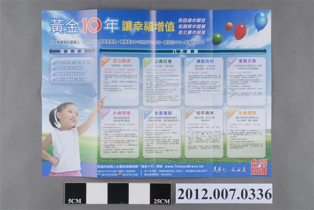 此物件為雙面印刷,三折再對折後使用,是中華民國第13任中國國民黨正副總統候選人馬英九與吳敦義的競選文宣,為其競選辦公室「臺灣加油讚」進行宣傳之用,文宣內容為對青年族群政策的政見、政績以及被命名為「黃金10年」的政見。 此物件為2012年第13任總統副總統選舉時中國國民黨候選人的相關宣傳品,此次選舉由代表中國國民黨的馬英九、吳敦義;代表民主進步黨的蔡英文、蘇嘉全;代表親民黨的宋楚瑜、林瑞雄參與選舉。代表國民黨的馬英九在競選中開設「臺灣加油讚」競選辦公室,並且以「不統不獨」的「兩岸」政策爭取選民選票。最終,代表國民黨的馬英九、吳敦義組合當選,馬英九成功連任第13任總統。