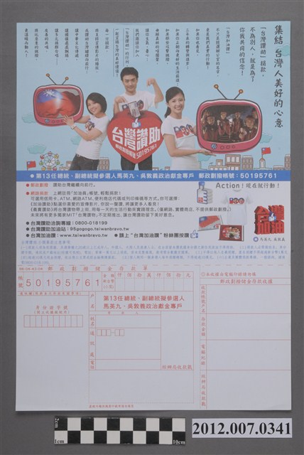 2012.007.0341 中華民國第13屆總統選舉候選人馬英九與吳敦義「臺灣讚助」政治獻金專戶宣傳單