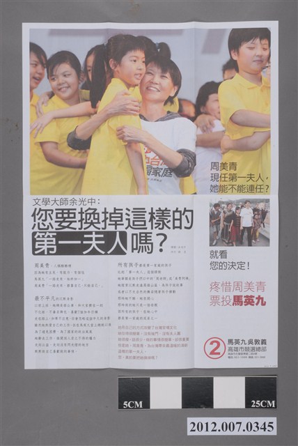 此物件為雙面印刷,是中華民國第13任中國國民黨正副總統候選人馬英九與吳敦義的競選文宣,其中一面標題為「團結!催票!防奧!」並署名為馬英九、吳敦義高雄市競選總布印行,並刊載於2012年1月13日進行的「選前之夜」的活動相關資訊。另一面則是提到馬英九的夫人周美青,並寫有鏢語「疼惜周美青 票投馬英九」。 此物件為2012年第13任總統副總統選舉時中國國民黨候選人的相關宣傳品,此次選舉由代表中國國民黨的馬英九、吳敦義;代表民主進步黨的蔡英文、蘇嘉全;代表親民黨的宋楚瑜、林瑞雄參與選舉。代表國民黨的馬英九在競選中開設「臺灣加油讚」競選辦公室,並且以「不統不獨」的「兩岸」政策爭取選民選票。最終,代表國民黨的馬英九、吳敦義組合當選,馬英九成功連任第13任總統。