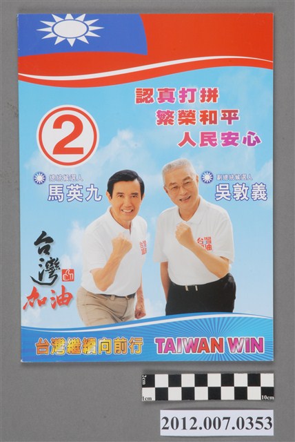 此物件為中華民國第13任中國國民黨正副總統候選人馬英九與吳敦義的競選文宣,為中鋼協力廠商馬吳後援會進行宣傳之用。 此物件為2012年第13任總統副總統選舉時中國國民黨候選人的相關宣傳品,此次選舉由代表中國國民黨的馬英九、吳敦義;代表民主進步黨的蔡英文、蘇嘉全;代表親民黨的宋楚瑜、林瑞雄參與選舉。代表國民黨的馬英九在競選中開設「臺灣加油讚」競選辦公室,並且以「不統不獨」的「兩岸」政策爭取選民選票。最終,代表國民黨的馬英九、吳敦義組合當選,馬英九成功連任第13任總統。