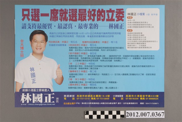 此為選舉宣傳單,標題為「表現不好就換掉」,為林國正於2012年為競選中華民國第8屆立法委員所印製。 林國正為國民黨籍政治人物,長期於高雄地區發展,曾任高雄區漁會總幹事、高雄市議員、立法委員,中國國民黨副秘書長。 2012年,中華民國首次將總統、立法委員選舉之投票作業合併施行,此一變革最主要的目標在於減省社會資源,並提升學生族群的參與度。總統、立法委員選舉合併投票的方案,早在2007年即被政府納入規劃,但遲遲未於各政黨間形成共識。此次新制施行,顯見的效應是立委選舉的受關注度遠低於總統選舉,且選民在立委選舉中投票分佈受到總統選情的牽引。最終,中國國民黨在此次立委選舉中單獨取得過半席次,成為國會中的最大政黨。