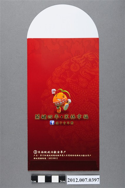 紅包袋正面印有「吉祥如意恭賀新禧」以及宋楚瑜之肖像,背面印有「關鍵四年、宋林幸福」與政治獻金專戶訊息,為中華民國第13任親民黨正副總統候選人宋楚瑜與林瑞雄競選團隊「橘子青年軍」進行宣傳之用。