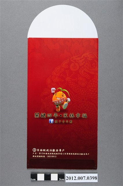 紅包袋正面印有「吉祥如意恭賀新禧」以及宋楚瑜之肖像,背面印有「關鍵四年、宋林幸福」與政治獻金專戶訊息,為中華民國第13任親民黨正副總統候選人宋楚瑜與林瑞雄競選團隊「橘子青年軍」進行宣傳之用。