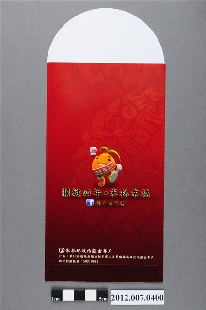 紅包袋正面印有「吉祥如意恭賀新禧」以及宋楚瑜之肖像,背面印有「關鍵四年、宋林幸福」與政治獻金專戶訊息,為中華民國第13任親民黨正副總統候選人宋楚瑜與林瑞雄競選團隊「橘子青年軍」進行宣傳之用。