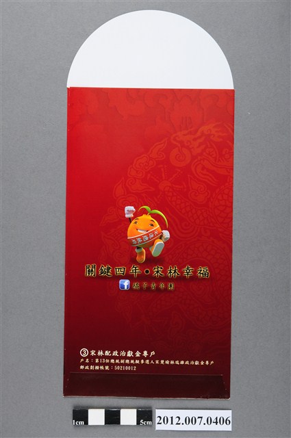 紅包袋正面印有「吉祥如意恭賀新禧」以及宋楚瑜之肖像,背面印有「關鍵四年、宋林幸福」與政治獻金專戶訊息,為中華民國第13任親民黨正副總統候選人宋楚瑜與林瑞雄競選團隊「橘子青年軍」進行宣傳之用。