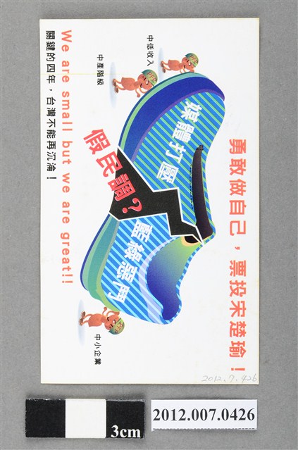 此物件為一紙質的競選文宣,其中一面印有中華民國第13任親民黨正副總統候選人宋楚瑜與林瑞雄提出的各項政見,下方則印有相關的宣傳網站資訊以及「政黨票請投⑨」的字樣,另一面則有對「媒體打壓」、「藍綠惡鬥」、「假民調」的批判圖像,以及「勇敢做自己,票投宋楚瑜!」的字樣。 此物件與2012總統選舉參選人的宋楚瑜、林瑞雄有所關聯,此次選舉由代表中國國民黨的馬英九、吳敦義;代表民主進步黨的蔡英文、蘇嘉全;代表親民黨的宋楚瑜、林瑞雄參與選舉。宋楚瑜於2011年9月投入總統選舉,此事件對於既有的選戰局勢產生影響。宋楚瑜在選舉中提出「拋開藍綠」的競選策略,希望以第三勢力的姿態爭取選民支持。最終,代表國民黨的馬英九、吳敦義組合當選,馬英九成功連任第13任總統。