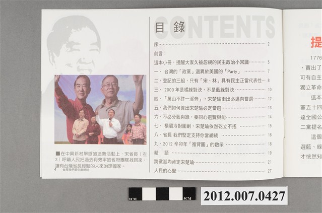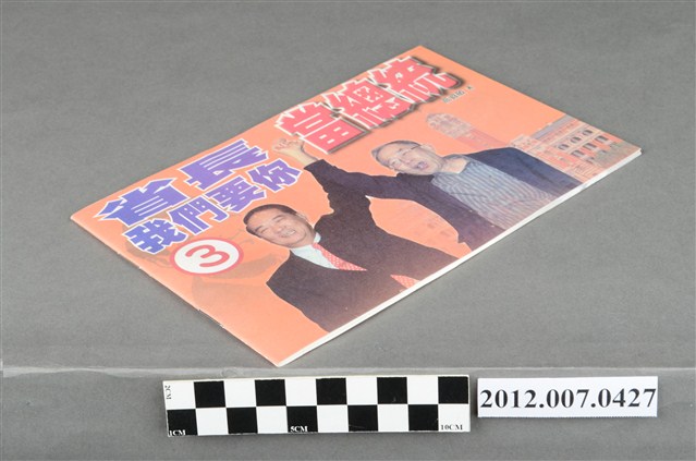 此物件為一紙質的競選文宣小冊,封面印有中華民國第13任親民黨正副總統候選人宋楚瑜與林瑞雄的照片,背景為總統府照片,上方印有此文宣標題「省長我們要你當總統」以及標示此文宣的作者為高資敏,背面則印有「推背圖」以及相關解釋,書冊內容為宋楚瑜的相關宣傳。 此物件與2012總統選舉參選人的宋楚瑜、林瑞雄有所關聯,此次選舉由代表中國國民黨的馬英九、吳敦義;代表民主進步黨的蔡英文、蘇嘉全;代表親民黨的宋楚瑜、林瑞雄參與選舉。宋楚瑜於2011年9月投入總統選舉,此事件對於既有的選戰局勢產生影響。宋楚瑜在選舉中提出「拋開藍綠」的競選策略,希望以第三勢力的姿態爭取選民支持。最終,代表國民黨的馬英九、吳敦義組合當選,馬英九成功連任第13任總統。