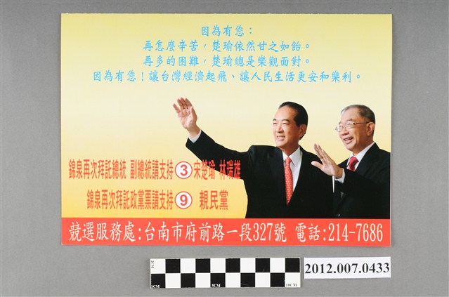 此物件與2012總統選舉參選人的宋楚瑜、林瑞雄有所關聯,此次選舉由代表中國國民黨的馬英九、吳敦義;代表民主進步黨的蔡英文、蘇嘉全;代表親民黨的宋楚瑜、林瑞雄參與選舉。宋楚瑜於2011年9月投入總統選舉,此事件對於既有的選戰局勢產生影響。宋楚瑜在選舉中提出「拋開藍綠」的競選策略,希望以第三勢力的姿態爭取選民支持。最終,代表國民黨的馬英九、吳敦義組合當選,馬英九成功連任第13任總統。