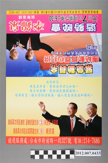 此物件為一紙質的造勢晚會邀請函,封面印有中華民國第13任親民黨正副總統候選人宋楚瑜與林瑞雄的照片,並印有「緊急動員令」、「造勢晚會」的字樣,此邀請函為前親民黨臺南市議員李錦泉發出的邀請函,內容則是宋楚瑜在臺南市造勢晚會的相關資訊。