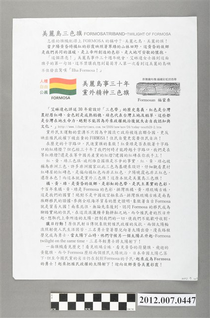此為政治文案,標題為「美麗島三色旗 FORMOSATRIBAND-TWILIGHT OF FORMASA」,內容簡述美麗島三色旗的設計理念、闡發歷史意涵。 「美麗島三色旗」的構想源自艾琳達(Linda Gail Arrigo)、陳菊在1979年「鼓山事件」期間,於美麗島雜誌高雄服務處為協助群眾辨識黨外人士所設計的三色彩帶,其紅、黃、綠三色分別代表臺灣農村的紅磚屋、稻穗與秧苗。2009年,高雄市政府舉辦「美麗島30週年暨世界人權影像展」,於捷運美麗島站邀請多位美麗島事件重要人士到場,艾琳達與陳菊也在此重述了三色帶的理念發想。 “Formosa”為拉丁文,意指「美麗」。葡萄牙人在15世紀以降的航海、殖民活動中探索世界,常以“Formosa”為其所見聞之新奇事物冠名,是以在世界五大洲裡皆有以“Formosa”為舊稱的地域。臺灣在早期的歐洲文獻中被標示為“Formosa”,並沿用於日治時期,但逐漸被契合本地口語的“Taiwan”所取代。1970年代臺灣社會的鄉土意識興起,知識份子開始重視在地歷史的挖掘與重塑,“Formosa”與「美麗島」、「原住民」等詞彙所聯繫的開放意象,開始成為有識之士在形塑反殖民認同象徵時,廣泛運用的符號。