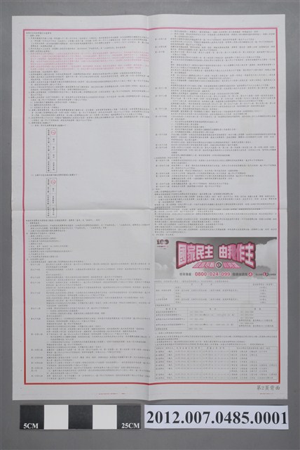 此物件為第8屆立法委員選舉選舉公報(臺北市第2選舉區――大同區、士林區),記載此選舉區的各候選人資料以及投票相關規範,投票日期為2012年1月14日,編印單位為臺北市選舉委員會。 2012年,中華民國首次將總統、立法委員選舉之投票作業合併施行,此一變革的目的在於減省社會資源、減少社會對立等等。總統、立法委員選舉合併投票的方案,早在2007年中華民國第12屆總統選舉前,即被政府納入規劃,但遲遲未於各政黨間形成共識。而在2012年的第8屆立法委員選舉中,中國國民黨在立法院總席次中單獨取得過半席次,成為當屆國會中的最大政黨。 臺灣的立法委員選舉始於1948年,在1947年的國民大會代表選舉之後接續展開。立法委員任期原為3年一任,但因國民黨政府制定「動員戡亂時期臨時條款」凍結憲法部分條文等原因之下,首屆立法委員的任期被持續延長,形成長達40餘年未改選之現象,是為「萬年國會」。1972年起,中華民國政府開始定期舉辦「增額立法委員選舉」。解嚴後,於1992年展開中央民意代表的全面改選。在2008年的第7屆立法委員選舉中,立委選制由「複數選區不可讓度制」改為「單一選區兩票制」,立委任期也改為4年。2012年,則修改選務期程,使立法委員與總統選舉一併舉行。