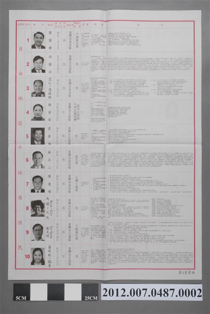 此物件為第8屆立法委員選舉選舉公報,記載各黨派自由地區山地、平地原住民候選人資料,以及投票相關規範。此次選舉之投票日期為2012年1月14日,公報編印單位為臺北市選舉委員會。 2012年,中華民國首次將總統、立法委員選舉之投票作業合併施行,此一變革的目的在於減省社會資源、減少社會對立等等。總統、立法委員選舉合併投票的方案,早在2007年中華民國第12屆總統選舉前,即被政府納入規劃,但遲遲未於各政黨間形成共識。而在2012年的第8屆立法委員選舉中,中國國民黨在立法院總席次中單獨取得過半席次,成為當屆國會中的最大政黨。 臺灣的立法委員選舉始於1948年,在1947年的國民大會代表選舉之後接續展開。立法委員任期原為3年一任,但因國民黨政府制定「動員戡亂時期臨時條款」凍結憲法部分條文等原因之下,首屆立法委員的任期被持續延長,形成長達40餘年未改選之現象,是為「萬年國會」。1972年起,中華民國政府開始定期舉辦「增額立法委員選舉」。解嚴後,於1992年展開中央民意代表的全面改選。在2008年的第7屆立法委員選舉中,立委選制由「複數選區不可讓度制」改為「單一選區兩票制」,立委任期也改為4年。2012年,則修改選務期程,使立法委員與總統選舉一併舉行。