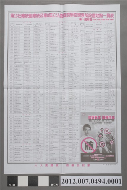 此物件為第8屆立法委員選舉選舉公報(臺中市第一選舉區――大甲區、大安區、外埔區、清水區、梧棲區),記載此選舉區的各候選人資料以及投票相關規範,投票日期為2012年1月14日,編印單位為臺中市選舉委員會。 2012年,中華民國首次將總統、立法委員選舉之投票作業合併施行,此一變革的目的在於減省社會資源、減少社會對立等等。總統、立法委員選舉合併投票的方案,早在2007年中華民國第12屆總統選舉前,即被政府納入規劃,但遲遲未於各政黨間形成共識。而在2012年的第8屆立法委員選舉中,中國國民黨在立法院總席次中單獨取得過半席次,成為當屆國會中的最大政黨。 臺灣的立法委員選舉始於1948年,在1947年的國民大會代表選舉之後接續展開。立法委員任期原為3年一任,但因國民黨政府制定「動員戡亂時期臨時條款」凍結憲法部分條文等原因之下,首屆立法委員的任期被持續延長,形成長達40餘年未改選之現象,是為「萬年國會」。1972年起,中華民國政府開始定期舉辦「增額立法委員選舉」。解嚴後,於1992年展開中央民意代表的全面改選。在2008年的第7屆立法委員選舉中,立委選制由「複數選區不可讓度制」改為「單一選區兩票制」,立委任期也改為4年。2012年,則修改選務期程,使立法委員與總統選舉一併舉行。