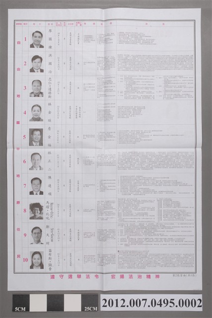 此物件為第8屆立法委員選舉選舉公報,記載各黨派自由地區山地、平地原住民候選人資料,以及投票相關規範。此次選舉之投票日期為2012年1月14日,公報編印單位為臺中市選舉委員會。 2012年,中華民國首次將總統、立法委員選舉之投票作業合併施行,此一變革的目的在於減省社會資源、減少社會對立等等。總統、立法委員選舉合併投票的方案,早在2007年中華民國第12屆總統選舉前,即被政府納入規劃,但遲遲未於各政黨間形成共識。而在2012年的第8屆立法委員選舉中,中國國民黨在立法院總席次中單獨取得過半席次,成為當屆國會中的最大政黨。 臺灣的立法委員選舉始於1948年,在1947年的國民大會代表選舉之後接續展開。立法委員任期原為3年一任,但因國民黨政府制定「動員戡亂時期臨時條款」凍結憲法部分條文等原因之下,首屆立法委員的任期被持續延長,形成長達40餘年未改選之現象,是為「萬年國會」。1972年起,中華民國政府開始定期舉辦「增額立法委員選舉」。解嚴後,於1992年展開中央民意代表的全面改選。在2008年的第7屆立法委員選舉中,立委選制由「複數選區不可讓度制」改為「單一選區兩票制」,立委任期也改為4年。2012年,則修改選務期程,使立法委員與總統選舉一併舉行。