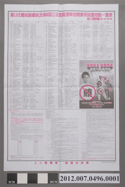 此物件為第8屆立法委員選舉選舉公報(臺中市第六選舉區――西區、中區、東區、南區),記載此選舉區的各候選人資料以及投票相關規範,投票日期為2012年1月14日,編印單位為臺中市選舉委員會。 2012年,中華民國首次將總統、立法委員選舉之投票作業合併施行,此一變革的目的在於減省社會資源、減少社會對立等等。總統、立法委員選舉合併投票的方案,早在2007年中華民國第12屆總統選舉前,即被政府納入規劃,但遲遲未於各政黨間形成共識。而在2012年的第8屆立法委員選舉中,中國國民黨在立法院總席次中單獨取得過半席次,成為當屆國會中的最大政黨。 臺灣的立法委員選舉始於1948年,在1947年的國民大會代表選舉之後接續展開。立法委員任期原為3年一任,但因國民黨政府制定「動員戡亂時期臨時條款」凍結憲法部分條文等原因之下,首屆立法委員的任期被持續延長,形成長達40餘年未改選之現象,是為「萬年國會」。1972年起,中華民國政府開始定期舉辦「增額立法委員選舉」。解嚴後,於1992年展開中央民意代表的全面改選。在2008年的第7屆立法委員選舉中,立委選制由「複數選區不可讓度制」改為「單一選區兩票制」,立委任期也改為4年。2012年,則修改選務期程,使立法委員與總統選舉一併舉行。