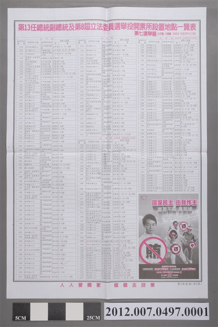 此物件為第8屆立法委員選舉選舉公報(臺中市第七選舉區――太平區、大理區,除東湖、西湖2里外之25里),記載此選舉區的各候選人資料以及投票相關規範,投票日期為2012年1月14日,編印單位為臺中市選舉委員會。 2012年,中華民國首次將總統、立法委員選舉之投票作業合併施行,此一變革的目的在於減省社會資源、減少社會對立等等。總統、立法委員選舉合併投票的方案,早在2007年中華民國第12屆總統選舉前,即被政府納入規劃,但遲遲未於各政黨間形成共識。而在2012年的第8屆立法委員選舉中,中國國民黨在立法院總席次中單獨取得過半席次,成為當屆國會中的最大政黨。 臺灣的立法委員選舉始於1948年,在1947年的國民大會代表選舉之後接續展開。立法委員任期原為3年一任,但因國民黨政府制定「動員戡亂時期臨時條款」凍結憲法部分條文等原因之下,首屆立法委員的任期被持續延長,形成長達40餘年未改選之現象,是為「萬年國會」。1972年起,中華民國政府開始定期舉辦「增額立法委員選舉」。解嚴後,於1992年展開中央民意代表的全面改選。在2008年的第7屆立法委員選舉中,立委選制由「複數選區不可讓度制」改為「單一選區兩票制」,立委任期也改為4年。2012年,則修改選務期程,使立法委員與總統選舉一併舉行。