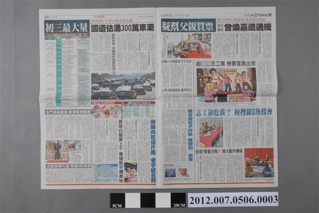 此為2012年1月7日發行的《自由時報》A5、A6、A11、A12版。內容要目計有〈超級週衝票 蔡馬宋總動員〉、〈人民顧飯碗 嗆馬633跳票〉、〈「我要好總統」評比 蔡最受肯定〉、〈疑幫父親買票 新北議員曾煥嘉遭通緝〉、〈組嫌賄志工隊 檢察官跳出來〉、〈志工領乾薪?檢搜羅福助後援會〉、〈陳定南兒子抨擊 陳歐珀:誤會〉、〈初三最大量 國道估湧300萬車潮 春節9天 可望分散交通流量〉、〈網購肉乾偷斤兩 老字號在列〉、〈買尾白鯧要上千 養殖魚評價美味〉、〈金門高梁配酒 跨海買到假酒〉、〈流感疫情升溫 再增4死病例〉、〈搶救阿塱壹美景 近六萬人連署停建台26線〉、〈愛心善狗CHERRY姐 全國最忙狗明星 捐款逾10萬元〉等。 此物件刊載2012年的第13任總統副總統選舉的相關報導,此次選舉由代表中國國民黨的馬英九、吳敦義;代表民主進步黨的蔡英文、蘇嘉全;代表親民黨的宋楚瑜、林瑞雄參與選舉。在選舉當中,中國與臺灣的「兩岸政見議題」成為人民選舉的重要觀察指標(王顥穎,2015:48-75)。另外、「塑化劑」、「宇昌案」、「夢想家音樂劇」、「三隻小豬」等等,都成為影響當時人民投票意向的事件。最終,代表國民黨的馬英九、吳敦義組合當選,馬英九成功連任第13任總統。 《自由時報》由聯邦集團林榮三經營。1988年報禁開放後,《自由時報》由地方媒體轉型為全國性報紙。《自由時報》在聯邦集團龐大的資源挹注下,在1997年前後大幅擴展訂戶數,開始與《聯合報》、《中國時報》並列為臺灣三大報。
