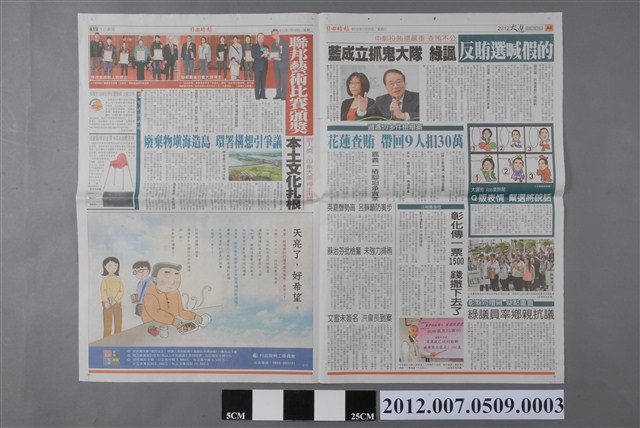此為2012年1月10日發行的《自由時報》A5、A6、A13、A14版。內容要目計有〈華爾街日報:臺灣中低收入勞工憤怒 對中經濟開放 馬可能輸掉大選〉、〈法新社:馬過度傾中 南臺灣選民不滿〉、〈中國南海政協顧問 林文定:雙英緊繃 中國很緊張〉、〈中彰投賄選嚴重 查賄不公 藍成立抓鬼大隊 綠諷反賄選喊假的〉、〈過濾50多件檢舉案 花蓮查賄 帶回9人扣30萬〉、〈大選夯 APP湊熱鬧 Q版表情 幫選將說話〉、〈彰化傳一票1500 錢灑下去了〉、〈彰縣府贈碗 疑點重重 綠議員率鄉親抗議〉、〈英嘉聲勢高 呂蘇籲防奧步〉、〈蘇治芬批檢警 未強力掃賄〉、〈文宣未簽名 洪會長到案〉、〈聯邦藝術比賽頒獎 本土文化扎根 新人獎、印象大獎 得主出爐〉、〈廢棄物填海造島 環署構想引爭議〉、〈鼓勵返鄉投票 成大生拍短片 網路夯〉、〈反制分裂投票 綠營齊挺陳唐山〉、〈臺灣三大危機 許添財提藥方〉、〈藍競選幹部:企業挺馬 是有壓力〉、〈臺南述記:改變中國〉(趙卿惠)等。 此物件刊載2012年的第13任總統副總統選舉的相關報導,此次選舉由代表中國國民黨的馬英九、吳敦義;代表民主進步黨的蔡英文、蘇嘉全;代表親民黨的宋楚瑜、林瑞雄參與選舉。在選舉當中,中國與臺灣的「兩岸政見議題」成為人民選舉的重要觀察指標(王顥穎,2015:48-75)。另外、「塑化劑」、「宇昌案」、「夢想家音樂劇」、「三隻小豬」等等,都成為影響當時人民投票意向的事件。最終,代表國民黨的馬英九、吳敦義組合當選,馬英九成功連任第13任總統。 《自由時報》由聯邦集團林榮三經營。1988年報禁開放後,《自由時報》由地方媒體轉型為全國性報紙。《自由時報》在聯邦集團龐大的資源挹注下,在1997年前後大幅擴展訂戶數,開始與《聯合報》、《中國時報》並列為臺灣三大報。