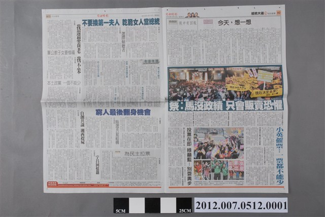 此為2012年1月13日發行的《自由時報》A1、A2、A15、A16版。內容要目計有〈臺灣未來 不能賣 蔡籲選民 不要投買票的政黨、候選人〉、〈社論:今天,想一想〉、〈自由談:親中有回報〉、〈蔡:馬沒政績 只會販賣恐懼〉、〈小英催票:一票都不能少〉、〈投票在即 綠籲藍:別耍奧步〉、〈不要換第一夫人 乾脆女人當總統〉(蔡小疋)、〈選擇傾聽者〉(宋廷棟)、〈我還想養老 我不笨〉(東陽)、〈軍公教子女要惜福〉(張尚義)、〈本土政黨 一個不能少〉(陳妙麗)、〈窮人最後翻身機會〉(周賢昱)、〈賄選共犯結構〉(黃帝穎)、〈自創共識 湘西趕屍〉(洪美華)、〈為民主拉票〉(黃國昌)、〈宇昌回憶錄〉(楊育民)等。 此物件刊載2012年的第13任總統副總統選舉的相關報導,此次選舉由代表中國國民黨的馬英九、吳敦義;代表民主進步黨的蔡英文、蘇嘉全;代表親民黨的宋楚瑜、林瑞雄參與選舉。在選舉當中,中國與臺灣的「兩岸政見議題」成為人民選舉的重要觀察指標(王顥穎,2015:48-75)。另外、「塑化劑」、「宇昌案」、「夢想家音樂劇」、「三隻小豬」等等,都成為影響當時人民投票意向的事件。最終,代表國民黨的馬英九、吳敦義組合當選,馬英九成功連任第13任總統。 《自由時報》由聯邦集團林榮三經營。1988年報禁開放後,《自由時報》由地方媒體轉型為全國性報紙。《自由時報》在聯邦集團龐大的資源挹注下,在1997年前後大幅擴展訂戶數,開始與《聯合報》、《中國時報》並列為臺灣三大報。