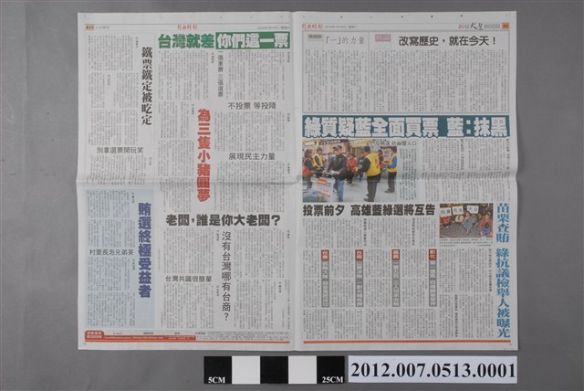 此為2012年1月14日發行的《自由時報》A1、A2、A15、A16版。內容要目計有〈臺灣未來 今天你決定〉、〈社論:改寫歷史 就在今天!〉、〈「一」的力量〉、〈綠質疑藍全面買票 藍:抹黑〉、〈苗栗查賄 綠抗議檢舉人被曝光〉、〈投票前夕 高雄藍綠選將戶告〉、〈臺灣就差你們這一票〉(李本和)、〈一張車票三張選票〉(趙柏昇)、〈不投票 等投降〉(劉瑩)、〈展現民主力量〉(陳儀深)、〈為三隻小豬圓夢〉(吳蓮進)、〈老闆,誰是你大老闆?〉(傅凱)、〈沒有臺灣哪有台商?〉(簡鴻綿)、〈臺灣共識很簡單〉(李明清)、〈鐵票鐵定被吃定〉(陳喬夫)、〈別拿選票開玩笑〉(文彬)、〈賄選終結受益者〉(鄭正煜)、〈村里長泡兄弟茶〉(蔡銘燦)等。 此物件刊載2012年的第13任總統副總統選舉的相關報導,此次選舉由代表中國國民黨的馬英九、吳敦義;代表民主進步黨的蔡英文、蘇嘉全;代表親民黨的宋楚瑜、林瑞雄參與選舉。在選舉當中,中國與臺灣的「兩岸政見議題」成為人民選舉的重要觀察指標(王顥穎,2015:48-75)。另外、「塑化劑」、「宇昌案」、「夢想家音樂劇」、「三隻小豬」等等,都成為影響當時人民投票意向的事件。最終,代表國民黨的馬英九、吳敦義組合當選,馬英九成功連任第13任總統。 《自由時報》由聯邦集團林榮三經營。1988年報禁開放後,《自由時報》由地方媒體轉型為全國性報紙。《自由時報》在聯邦集團龐大的資源挹注下,在1997年前後大幅擴展訂戶數,開始與《聯合報》、《中國時報》並列為臺灣三大報。