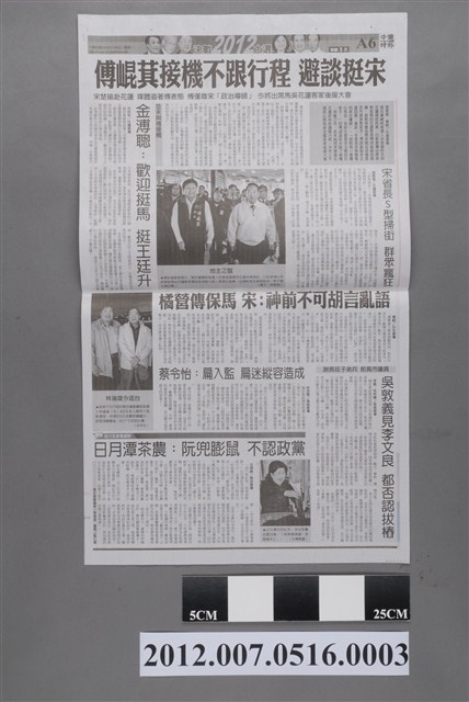 此為2012年1月9日發行的《中國時報》A5、A6版。內容要目計有〈蔡:馬沒政績 才打兩岸安定牌〉、〈守候小英 臺南街道水洩不通〉、〈蔡再提聯合政府 馬營:選舉操作〉、〈小英:新北市過半 臺灣就過關〉、〈蔡:還要再過四年這樣的日子嗎?〉、〈小英彰化造勢 喊「小贏4萬票」〉、〈李登輝 可能站臺挺小英〉、〈傅崐萁接機不跟行程 避談挺宋〉、〈金溥聰:歡迎挺馬 挺王挺升〉、〈宋省長S型掃街 群眾瘋狂〉、〈橘營傳保馬 宋:神前不可胡言亂語〉、〈蔡令怡:扁入監 扁迷縱容造成〉、〈謝長廷子弟兵 前高市議員 吳敦義見李文良 都否認拔樁〉、〈日月潭茶農:阮都膨鼠 不認政黨〉等。 此物件刊載2012年的第13任總統副總統選舉的相關報導,此次選舉由代表中國國民黨的馬英九、吳敦義;代表民主進步黨的蔡英文、蘇嘉全;代表親民黨的宋楚瑜、林瑞雄參與選舉。在選舉當中,中國與臺灣的「兩岸政見議題」成為人民選舉的重要觀察指標(王顥穎,2015:48-75)。另外、「塑化劑」、「宇昌案」、「夢想家音樂劇」、「三隻小豬」等等,都成為影響當時人民投票意向的事件。最終,代表國民黨的馬英九、吳敦義組合當選,馬英九成功連任第13任總統。 《中國時報》的前身為《徵信新聞報》,是由曾任中國國民黨中央常務委員的余紀忠所創立報紙,在1968年9月起改名為《中國時報》。在余紀忠主導下,《中國時報》被譽為「文人辦報」之代表,之後余紀忠於2002年逝世。中國時報報系自2007年起改組轉型為「中時媒體集團」,2008年,中時媒體集團為旺旺集團所收購,更名為「旺旺中時媒體集團」。