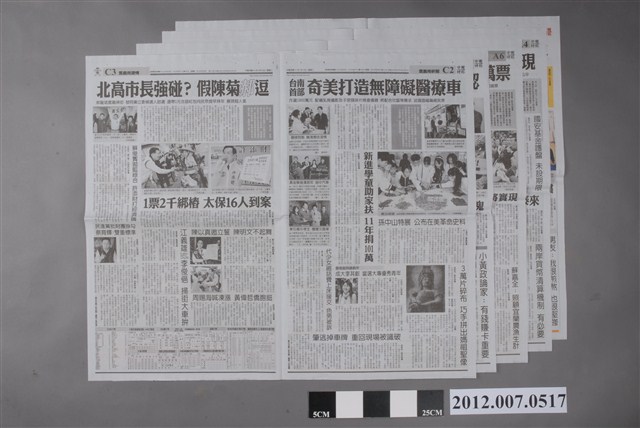 此為2012年1月10日發行的《中國時報》A、C版,此物件共計5張、18個版面。 此物件刊載2012年的第13任總統副總統選舉的相關報導,此次選舉由代表中國國民黨的馬英九、吳敦義;代表民主進步黨的蔡英文、蘇嘉全;代表親民黨的宋楚瑜、林瑞雄參與選舉。在選舉當中,中國與臺灣的「兩岸政見議題」成為人民選舉的重要觀察指標(王顥穎,2015:48-75)。另外、「塑化劑」、「宇昌案」、「夢想家音樂劇」、「三隻小豬」等等,都成為影響當時人民投票意向的事件。最終,代表國民黨的馬英九、吳敦義組合當選,馬英九成功連任第13任總統。 《中國時報》的前身為《徵信新聞報》,是由曾任中國國民黨中央常務委員的余紀忠所創立報紙,在1968年9月起改名為《中國時報》。在余紀忠主導下,《中國時報》被譽為「文人辦報」之代表,之後余紀忠於2002年逝世。中國時報報系自2007年起改組轉型為「中時媒體集團」,2008年,中時媒體集團為旺旺集團所收購,更名為「旺旺中時媒體集團」。