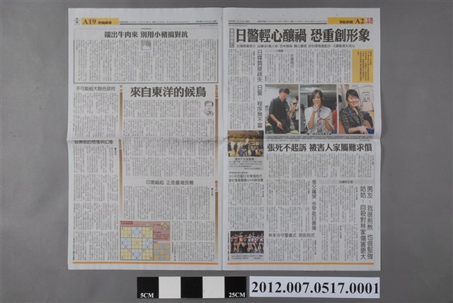 此為2012年1月10日發行的《中國時報》A1、A2、A19、A20版。內容要目計有〈留日女生命案兇手 張志揚被逮 警署前自刎亡〉、〈本報專訪 兩岸政策正確 民眾就會靠過來! 陳沖:生活安定才是臺灣共識〉、〈托育補助 擴及年入113萬以下〉、〈張嫌割頸亡 日警輕心釀禍 恐重創形象〉、〈日媒質疑疏失 日警:程序無不當〉、〈張死不起訴 被害人家屬難求償〉、〈社論:端出牛肉來 別用小豬搞對抗〉、〈張瑞昌專欄:來自東洋的候鳥〉、〈短評:不可能組大聯合政府〉、〈觀念平台:印度崛起 正是臺灣良機〉(方天賜)、〈我見我思:投票前的想像與幻象〉(張景為)等。 此物件刊載2012年的第13任總統副總統選舉的相關報導,此次選舉由代表中國國民黨的馬英九、吳敦義;代表民主進步黨的蔡英文、蘇嘉全;代表親民黨的宋楚瑜、林瑞雄參與選舉。在選舉當中,中國與臺灣的「兩岸政見議題」成為人民選舉的重要觀察指標(王顥穎,2015:48-75)。另外、「塑化劑」、「宇昌案」、「夢想家音樂劇」、「三隻小豬」等等,都成為影響當時人民投票意向的事件。最終,代表國民黨的馬英九、吳敦義組合當選,馬英九成功連任第13任總統。 《中國時報》的前身為《徵信新聞報》,是由曾任中國國民黨中央常務委員的余紀忠所創立報紙,在1968年9月起改名為《中國時報》。在余紀忠主導下,《中國時報》被譽為「文人辦報」之代表,之後余紀忠於2002年逝世。中國時報報系自2007年起改組轉型為「中時媒體集團」,2008年,中時媒體集團為旺旺集團所收購,更名為「旺旺中時媒體集團」。