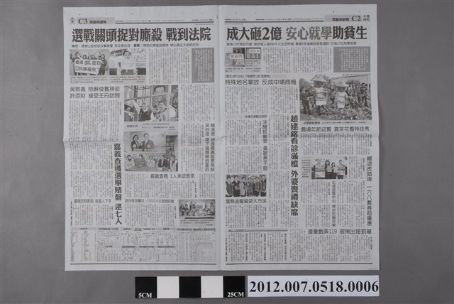 此為2012年1月11日發行的《中國時報》C1、C2、C3、C4版。內容要目計有〈候選人比拼 吉祥物撐腰〉、〈農漁會「非法」拉票 雲縣府保密專線 鼓勵申訴〉、〈成大砸2億 安心就學助貧生〉、〈特殊地名掌故 反成中埔商機〉、〈農場年節迎賓 賞茶花看特技秀〉、〈趙建銘看診滿檔 外婆喪禮缺席〉、〈涉違反選罷法被訴 涂醒哲無罪 黃敏惠不服〉、〈暢遊虎頭埤 一六八套卷超優惠〉、〈北港遊客中心 帶你吃喝玩樂〉、〈連番戲弄119 被揪出接罰單〉、〈選戰關頭捉隊廝殺 戰到法院〉、〈吳敦義 陪蘇俊賓掃街 許添財 接受王丹訪問〉、〈賴清德 現身嘉義挺蔡易餘 吳伯雄 南下猛推銷翁重鈞〉、〈嘉義查獲選舉賭盤 逮七人〉、〈嘉義查賄 1人承認賣票〉、〈首投族受矚目 小英姊妹會溫情呼喚〉、〈選舉詐財新招 挑老人下手〉、〈選戰白熱化 藍綠青年軍上陣〉、〈簡志偉挺友妻 自嘲比跑新聞還累〉、〈捨選立委挺馬 蔡育輝拼藍天〉等。 此物件刊載2012年的第13任總統副總統選舉的相關報導,此次選舉由代表中國國民黨的馬英九、吳敦義;代表民主進步黨的蔡英文、蘇嘉全;代表親民黨的宋楚瑜、林瑞雄參與選舉。在選舉當中,中國與臺灣的「兩岸政見議題」成為人民選舉的重要觀察指標(王顥穎,2015:48-75)。另外、「塑化劑」、「宇昌案」、「夢想家音樂劇」、「三隻小豬」等等,都成為影響當時人民投票意向的事件。最終,代表國民黨的馬英九、吳敦義組合當選,馬英九成功連任第13任總統。 《中國時報》的前身為《徵信新聞報》,是由曾任中國國民黨中央常務委員的余紀忠所創立報紙,在1968年9月起改名為《中國時報》。在余紀忠主導下,《中國時報》被譽為「文人辦報」之代表,之後余紀忠於2002年逝世。中國時報報系自2007年起改組轉型為「中時媒體集團」,2008年,中時媒體集團為旺旺集團所收購,更名為「旺旺中時媒體集團」。