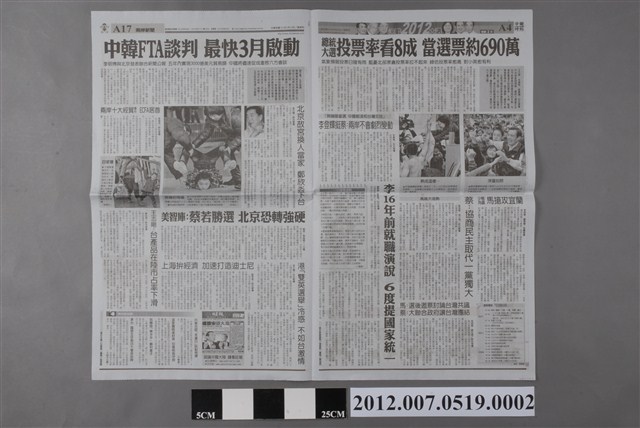 此為2012年1月12日發行的《中國時報》A3、A4、A17、A18版。內容要目計有〈宋:沒有棄保 只有選賢與能〉、〈連棄保喊話 宋:藍不是才說民調遙遙領先?〉、〈總統大選投票率看8成 當選票約690萬〉、〈李登輝挺蔡:兩岸不會劇烈變動〉、〈高雄大造勢 蔡:協商式民主取代一黨獨大〉、〈少輸為贏 馬搶攻宜蘭〉、〈馬:選後邀蔡討論臺灣共識 蔡大聯合政府讓臺灣團結〉、〈李16年前就職演說 6度提國家統一〉、〈中韓FTA談判 最快3月啟動〉、〈兩岸十大經貿事件 ECFA居首〉、〈北京故宮換人當家 鄭欣淼下台〉、〈美智庫:蔡若勝選 北京恐轉強硬〉、〈王志剛:臺產品在陸市佔率下滑〉、〈上海拼經濟 加速打造迪士尼〉、〈港「雙英選舉」冷感 不如臺激情〉、〈凱薩的面具:蔡英文唱的 其實是一首天上曲〉(王健壯)、〈學界利益衝突 應加規範〉(周成功)、〈教育有缺憾 生命失焦了〉(陳復)等。 此物件刊載2012年的第13任總統副總統選舉的相關報導,此次選舉由代表中國國民黨的馬英九、吳敦義;代表民主進步黨的蔡英文、蘇嘉全;代表親民黨的宋楚瑜、林瑞雄參與選舉。在選舉當中,中國與臺灣的「兩岸政見議題」成為人民選舉的重要觀察指標(王顥穎,2015:48-75)。另外、「塑化劑」、「宇昌案」、「夢想家音樂劇」、「三隻小豬」等等,都成為影響當時人民投票意向的事件。最終,代表國民黨的馬英九、吳敦義組合當選,馬英九成功連任第13任總統。 《中國時報》的前身為《徵信新聞報》,是由曾任中國國民黨中央常務委員的余紀忠所創立報紙,在1968年9月起改名為《中國時報》。在余紀忠主導下,《中國時報》被譽為「文人辦報」之代表,之後余紀忠於2002年逝世。中國時報報系自2007年起改組轉型為「中時媒體集團」,2008年,中時媒體集團為旺旺集團所收購,更名為「旺旺中時媒體集團」。