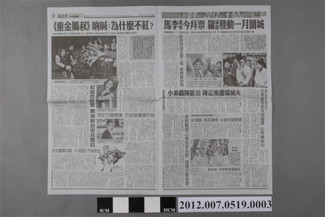 此為2012年1月12日發行的《中國時報》A5、A6、A15、A16版。內容要目計有〈高孔廉:別為選舉扭曲九二共識事實〉、〈串聯白手起家企業 宣明智挺馬 兩岸好關係不能停〉、〈包道格抵台觀選 定位私人行程〉、〈國臺辦取消記者會 陸媒接到噤聲令〉、〈馬、李慶華今拜票 羅福助發動一月圍城〉、〈酷酷嫂進庇護工廠〉、〈唐寶寶抱抱〉、〈小乖轟陳歐珀 陳定南遺孀滅火〉、〈面對小我大我 陳菊很掙扎 呂秀蓮祝郭玟成當選 心疼陳致中〉、〈賴清德嗆臺南市贏30萬票 金溥聰:南部選情 必會跌破眼鏡〉、〈南縣醫師公會挺李全教〉、〈綠爆分裂投票〉、〈最高檢:未搜李進勇總部〉、〈《重金屬叔》吶喊:為什麼不紅?〉、〈紀蔚然談愛 魏海敏扮埃及豔后〉、〈德國新星 史岱費爾德 巴哈首獎彈巴哈〉、〈臺北書展20歲《小甜甜》作者訪臺〉、〈羅姆尼初選再勝 緊追歐巴馬〉、〈伊核科學家被炸死 以下手?〉、〈媒體大咖 挺希拉蕊任歐巴馬副手〉、〈30年前血腥政變 土前總統被訴〉、〈傳不倫、沾黑道 蓮舫恐被降級〉等。 此物件刊載2012年的第13任總統副總統選舉的相關報導,此次選舉由代表中國國民黨的馬英九、吳敦義;代表民主進步黨的蔡英文、蘇嘉全;代表親民黨的宋楚瑜、林瑞雄參與選舉。在選舉當中,中國與臺灣的「兩岸政見議題」成為人民選舉的重要觀察指標(王顥穎,2015:48-75)。另外、「塑化劑」、「宇昌案」、「夢想家音樂劇」、「三隻小豬」等等,都成為影響當時人民投票意向的事件。最終,代表國民黨的馬英九、吳敦義組合當選,馬英九成功連任第13任總統。 《中國時報》的前身為《徵信新聞報》,是由曾任中國國民黨中央常務委員的余紀忠所創立報紙,在1968年9月起改名為《中國時報》。在余紀忠主導下,《中國時報》被譽為「文人辦報」之代表,之後余紀忠於2002年逝世。中國時報報系自2007年起改組轉型為「中時媒體集團」,2008年,中時媒體集團為旺旺集團所收購,更名為「旺旺中時媒體集團」。