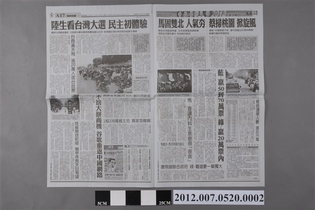 此為2012年1月13日發行的《中國時報》A3、A4、A17、A18版。內容要目計有〈站台挺蔡 李遠哲:宇昌案是臺灣生技發展典範〉、〈對外媒重申 九二共識不存在 蕭美琴:臺灣共識更穩定、持續〉、〈馬固雙北人氣夯〉、〈蔡掃桃園掀旋風〉、〈藍:贏50到70萬票 綠:贏20萬票內〉、〈馬:會讓內科生意作得很「爽」〉、〈唐飛嗆聯合政府 綠:難道要一黨獨大〉、〈總統選舉人數 增加76萬〉、〈陸生看臺灣大選 民主初體驗〉、〈台商滿天飛 逾20萬人返台投票〉、〈對岸去年底CPI 4.1% 創15月新低〉、〈1瓶338萬威士忌 買家怨難喝〉、〈不捨大餅商機 谷歌重返中國網路〉、〈陸擬開挖乾陵 蘭亭序見天日有望〉、〈小小郭、殷仔簽書會 球迷笑翻〉、〈紀念多福曼 郭泓志刺青臂上〉、〈建仔赴美備戰 行前祈福〉、〈小胡當印地安人 受邀春訓〉、〈牛開訓 火哥、小沈喜獲3年約〉、〈莊勝雄助桃猿 花花加薪五成〉、〈38歲高建三 從沒投過票〉等。 此物件刊載2012年的第13任總統副總統選舉的相關報導,此次選舉由代表中國國民黨的馬英九、吳敦義;代表民主進步黨的蔡英文、蘇嘉全;代表親民黨的宋楚瑜、林瑞雄參與選舉。在選舉當中,中國與臺灣的「兩岸政見議題」成為人民選舉的重要觀察指標(王顥穎,2015:48-75)。另外、「塑化劑」、「宇昌案」、「夢想家音樂劇」、「三隻小豬」等等,都成為影響當時人民投票意向的事件。最終,代表國民黨的馬英九、吳敦義組合當選,馬英九成功連任第13任總統。 《中國時報》的前身為《徵信新聞報》,是由曾任中國國民黨中央常務委員的余紀忠所創立報紙,在1968年9月起改名為《中國時報》。在余紀忠主導下,《中國時報》被譽為「文人辦報」之代表,之後余紀忠於2002年逝世。中國時報報系自2007年起改組轉型為「中時媒體集團」,2008年,中時媒體集團為旺旺集團所收購,更名為「旺旺中時媒體集團」。