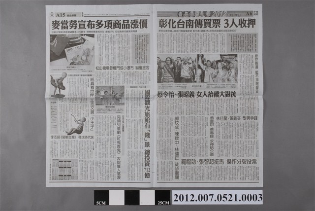此為2012年1月14日發行的《中國時報》A5、A6、A15、A16版。內容要目計有〈彰化臺南傳買票 3人收押〉、〈綠控賄選 藍不排除提告〉、〈蔡令怡、張昭義 女人抬轎大對抗〉、〈林佳龍、黃義交 型男爭鋒〉、〈翁重鈞、蔡易餘 求神給公道〉、〈郭玟成、陳致中、林國正 徒步衝關〉、〈羅福助、張智超挺馬 操作分裂投票〉、〈麥當勞宣布多項商品漲價〉、〈松山機場登機門成小瀑布 嚇傻旅客〉、〈大雪山漂流木 激發創作動機 純真看世界 王志文展「小王子」〉、〈頂級飯店 入駐臺灣 國際觀光旅館有「錢」景 總投資712億〉、〈日本文學 臺灣劇團 另類兒童劇《紅鬼青鬼》友誼催人落淚〉、〈李志銘《裝幀臺灣》尋找時代味〉、〈緬甸特赦政治犯 前總理欽紐獲釋〉、〈逃亡太累 越獄陸嫌自願回籠〉、〈日內閣改組 蓮舫等五閣員除名〉、〈牛津大學血案 教授陳屍同僚家中〉、〈拷貝有理 分享無罪 瑞典認可 拷貝教列合法宗教〉、〈美拉警報:曼谷面臨恐怖攻擊〉等。 此物件刊載2012年的第13任總統副總統選舉的相關報導,此次選舉由代表中國國民黨的馬英九、吳敦義;代表民主進步黨的蔡英文、蘇嘉全;代表親民黨的宋楚瑜、林瑞雄參與選舉。在選舉當中,中國與臺灣的「兩岸政見議題」成為人民選舉的重要觀察指標(王顥穎,2015:48-75)。另外、「塑化劑」、「宇昌案」、「夢想家音樂劇」、「三隻小豬」等等,都成為影響當時人民投票意向的事件。最終,代表國民黨的馬英九、吳敦義組合當選,馬英九成功連任第13任總統。 《中國時報》的前身為《徵信新聞報》,是由曾任中國國民黨中央常務委員的余紀忠所創立報紙,在1968年9月起改名為《中國時報》。在余紀忠主導下,《中國時報》被譽為「文人辦報」之代表,之後余紀忠於2002年逝世。中國時報報系自2007年起改組轉型為「中時媒體集團」,2008年,中時媒體集團為旺旺集團所收購,更名為「旺旺中時媒體集團」。