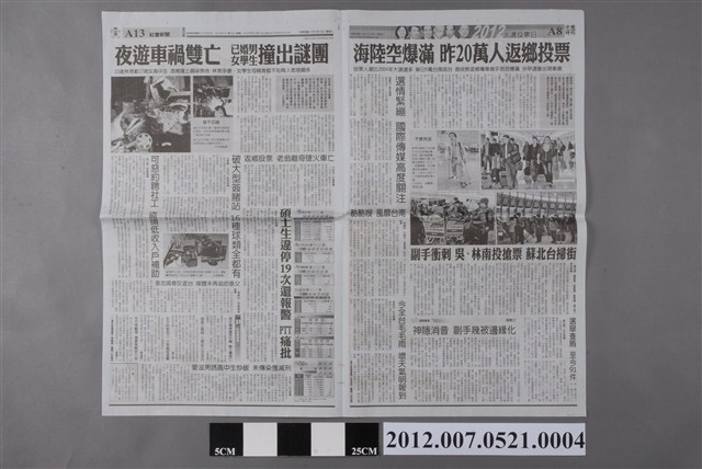 此為2012年1月14日發行的《中國時報》A7、A8、A13、A14版。內容要目計有〈海陸空爆滿 昨20萬人返鄉投票〉、〈選情緊繃 國際傳媒高度關注〉、〈酷酷嫂 風靡臺南〉、〈副手衝刺 吳、林南投搶票 蘇北臺掃街〉、〈選舉查賄 至今91件〉、〈選戰觀察:神隱消音 副手幾被邊緣化〉(單厚之)、〈今全台毛毛雨 壞天氣明報到〉、〈夜遊車禍雙亡 已婚男女學生撞出迷團〉、〈返鄉投票 老翁離奇墜火車亡〉、〈破大型簽賭站 16種球類全都有〉、〈可惡約聘工 盜領低收入戶補助〉、〈碩士生違停19次還報警 PTT痛批〉、〈愛滋男誘高中生炒飯 未傳染獲減刑〉等。 此物件刊載2012年的第13任總統副總統選舉的相關報導,此次選舉由代表中國國民黨的馬英九、吳敦義;代表民主進步黨的蔡英文、蘇嘉全;代表親民黨的宋楚瑜、林瑞雄參與選舉。在選舉當中,中國與臺灣的「兩岸政見議題」成為人民選舉的重要觀察指標(王顥穎,2015:48-75)。另外、「塑化劑」、「宇昌案」、「夢想家音樂劇」、「三隻小豬」等等,都成為影響當時人民投票意向的事件。最終,代表國民黨的馬英九、吳敦義組合當選,馬英九成功連任第13任總統。 《中國時報》的前身為《徵信新聞報》,是由曾任中國國民黨中央常務委員的余紀忠所創立報紙,在1968年9月起改名為《中國時報》。在余紀忠主導下,《中國時報》被譽為「文人辦報」之代表,之後余紀忠於2002年逝世。中國時報報系自2007年起改組轉型為「中時媒體集團」,2008年,中時媒體集團為旺旺集團所收購,更名為「旺旺中時媒體集團」。