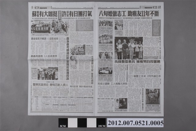 此為2012年1月14日發行的《中國時報》C1、C2、C3、C4版。內容要目計有〈最後一夜 藍綠冒雨掃街衝選票〉、〈嘉市圓環噴水池 3軍叫陣〉、〈嘉縣有利綠軍?藍營力求翻盤〉、〈候選人今天最想做的事:補眠跑步 好好陪一陪家人〉、〈七股顧曬員工自救會 挺馬〉、〈八旬嬤做志工 助癌友11年不斷〉、〈找警員當救兵 擁槍男自投羅網〉、〈後壁上水米 2月外銷日本〉、〈完成父遺願 工人捐萬元濟弱〉、〈蘇俊賓有大咖挺 選前衝刺 許添財有日團打氣〉、〈農會藉尾牙輔選。綠錄影檢舉〉、〈嘉義再查賄 3人坦承賣票〉、〈農漁會考績逼拉票 雲縣府接獲投訴〉、〈抹黑陳唐山文宣 警查扣偵辦〉、〈南市計票預計9點前完成〉、〈雙陳民雄掃街 鞭炮四射人擠人〉、〈臉書打選戰 「紅豆冰」名聲響〉、〈另類志工 天天舉牌拉選票〉、〈大廚料理 選舉飯好好吃〉等。 此物件刊載2012年的第13任總統副總統選舉的相關報導,此次選舉由代表中國國民黨的馬英九、吳敦義;代表民主進步黨的蔡英文、蘇嘉全;代表親民黨的宋楚瑜、林瑞雄參與選舉。在選舉當中,中國與臺灣的「兩岸政見議題」成為人民選舉的重要觀察指標(王顥穎,2015:48-75)。另外、「塑化劑」、「宇昌案」、「夢想家音樂劇」、「三隻小豬」等等,都成為影響當時人民投票意向的事件。最終,代表國民黨的馬英九、吳敦義組合當選,馬英九成功連任第13任總統。 《中國時報》的前身為《徵信新聞報》,是由曾任中國國民黨中央常務委員的余紀忠所創立報紙,在1968年9月起改名為《中國時報》。在余紀忠主導下,《中國時報》被譽為「文人辦報」之代表,之後余紀忠於2002年逝世。中國時報報系自2007年起改組轉型為「中時媒體集團」,2008年,中時媒體集團為旺旺集團所收購,更名為「旺旺中時媒體集團」。