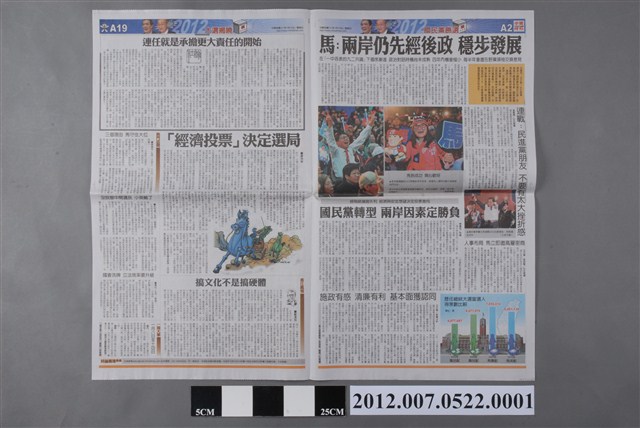 此為2012年1月15日發行的《中國時報》A1、A2、A19、A20版。內容要目計有〈得票過半 馬英九連任總統〉、〈兩岸安定牌奏效 承諾繼續改革 美國白宮聲明祝賀〉、〈新國會 藍64席過半 綠40席小漲〉、〈馬:兩岸仍先經後政 穩步發展〉、〈連戰:民進黨朋友 不要有太大挫折感〉、〈國民黨轉型 兩岸因素定勝負〉、〈人事佈局 馬立即邀高層密商〉、〈施政有感 清廉有利 基本面獲認同〉、〈社論:連任就是承擔更大責任的開始〉、〈「經濟投票」決定選局〉、〈香江風情:搞文化不是搞硬體〉(鄭漢良)等。 此物件刊載2012年的第13任總統副總統選舉的相關報導,此次選舉由代表中國國民黨的馬英九、吳敦義;代表民主進步黨的蔡英文、蘇嘉全;代表親民黨的宋楚瑜、林瑞雄參與選舉。在選舉當中,中國與臺灣的「兩岸政見議題」成為人民選舉的重要觀察指標(王顥穎,2015:48-75)。另外、「塑化劑」、「宇昌案」、「夢想家音樂劇」、「三隻小豬」等等,都成為影響當時人民投票意向的事件。最終,代表國民黨的馬英九、吳敦義組合當選,馬英九成功連任第13任總統。 《中國時報》的前身為《徵信新聞報》,是由曾任中國國民黨中央常務委員的余紀忠所創立報紙,在1968年9月起改名為《中國時報》。在余紀忠主導下,《中國時報》被譽為「文人辦報」之代表,之後余紀忠於2002年逝世。中國時報報系自2007年起改組轉型為「中時媒體集團」,2008年,中時媒體集團為旺旺集團所收購,更名為「旺旺中時媒體集團」。