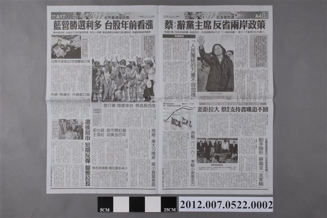 此為2012年1月15日發行的《中國時報》A3、A4、A17、A18版。內容要目計有〈戰法活 金溥聰讓國民黨脫胎換骨〉、〈團結泛藍 連戰無私輔選立大功〉、〈關鍵救援 周美青無聲勝有聲〉、〈著眼世代交替 內閣改組「慢慢來」陳江配呼聲高〉、〈選民背書 兩岸關係邁大步〉、〈蔡:辭黨主席 反省兩岸政策〉、〈敗選感言「人民團結的力量不容忽視」〉、〈差距拉大 蔡總部持者嘆追不回〉、〈從農舍風暴到另一半洪恆珠爭議 副手隱形 蘇嘉全「全家輸」〉、〈再戰2016?考驗小英意志力〉、〈藍營勝選利多 台股年前看漲〉、〈臺幣可望演出2字頭慶祝行情〉、〈外銀:馬連任 外資鬆口氣〉、〈旅行業:陸客來臺 將成長四成〉、〈商總:應大刀闊斧 縮小貧富差距〉、〈郭台銘:股市開紅盤 王雪紅:迎黃金四年〉、〈楊志良落榜:南北差距減少〉、〈選後房市 短期反彈 盤整拉長〉、〈美讚臺:亞洲偉大的成功故事〉、〈華府專家:三不政策獲支持〉、〈外媒:兩岸關係是勝選關鍵〉、〈陸4大入口網同步開票 網民稱榜樣「臺灣逐步改變大陸」〉、〈陸台辦:兩岸和平是正道〉、〈陸學者:政治談判勿操之過急〉、〈日政論家:臺灣人要的是安定〉、〈港觀選:民眾希望維持現狀〉等。 此物件刊載2012年的第13任總統副總統選舉的相關報導,此次選舉由代表中國國民黨的馬英九、吳敦義;代表民主進步黨的蔡英文、蘇嘉全;代表親民黨的宋楚瑜、林瑞雄參與選舉。在選舉當中,中國與臺灣的「兩岸政見議題」成為人民選舉的重要觀察指標(王顥穎,2015:48-75)。另外、「塑化劑」、「宇昌案」、「夢想家音樂劇」、「三隻小豬」等等,都成為影響當時人民投票意向的事件。最終,代表國民黨的馬英九、吳敦義組合當選,馬英九成功連任第13任總統。 《中國時報》的前身為《徵信新聞報》,是由曾任中國國民黨中央常務委員的余紀忠所創立報紙,在1968年9月起改名為《中國時報》。在余紀忠主導下,《中國時報》被譽為「文人辦報」之代表,之後余紀忠於2002年逝世。中國時報報系自2007年起改組轉型為「中時媒體集團」,2008年,中時媒體集團為旺旺集團所收購,更名為「旺旺中時媒體集團」。