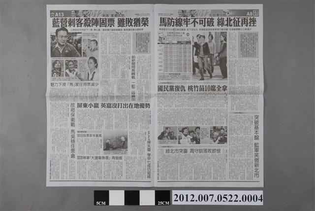 此為2012年1月15日發行的《中國時報》A7、A8、A13、A14版。內容要目計有〈宋微笑面對敗選 感謝黨團成立〉、〈老頑童林瑞雄 快樂選舉 比宋還搶戲〉、〈選民分裂投票 橘營早有數〉、〈宋得票慘敗 另創國會新舞台〉、〈李俊俋贏江義雄437票 可依法驗票〉、〈廢票九萬多 四次大選最低〉、〈馬防線牢不可破 綠北征再挫〉、〈國民黨復仇 桃竹苗10席全拿〉、〈突破基本盤 藍軍笑傲新北市〉、〈綠北市突圍 周守訓落敗飲恨〉、〈藍營刺客殺陣固票 雖敗猶榮〉、〈魅力下滑「馬」家庄得票減少〉、〈屏東小贏 英嘉沒打出在地優勢〉、〈故鄉保衛戰 馬吳穩住票倉〉、〈ECFA牌失靈 學甲七成仍挺綠〉、〈扁效應有限 官田投票率未衝高〉、〈鶯歌鎮建德里 神準「大選章魚哥」再發威〉、〈綠委氣旺 光復宜蘭 進駐離島〉、〈泛藍分裂 劉欋豪在臺東插綠旗〉、〈復興淡水河奏效 姚文智破八仙〉、〈氣走中市戰場老將 江啟臣贏得漂亮〉、〈桃園綠地變藍天 廖正井復仇〉、〈邱議瑩 旗美區贏得辛苦〉、〈埋首經營媽祖 陳雪生開花節過〉、〈博士搶攻竹縣 徐欣瑩全國第一高票〉等。 此物件刊載2012年的第13任總統副總統選舉的相關報導,此次選舉由代表中國國民黨的馬英九、吳敦義;代表民主進步黨的蔡英文、蘇嘉全;代表親民黨的宋楚瑜、林瑞雄參與選舉。在選舉當中,中國與臺灣的「兩岸政見議題」成為人民選舉的重要觀察指標(王顥穎,2015:48-75)。另外、「塑化劑」、「宇昌案」、「夢想家音樂劇」、「三隻小豬」等等,都成為影響當時人民投票意向的事件。最終,代表國民黨的馬英九、吳敦義組合當選,馬英九成功連任第13任總統。 《中國時報》的前身為《徵信新聞報》,是由曾任中國國民黨中央常務委員的余紀忠所創立報紙,在1968年9月起改名為《中國時報》。在余紀忠主導下,《中國時報》被譽為「文人辦報」之代表,之後余紀忠於2002年逝世。中國時報報系自2007年起改組轉型為「中時媒體集團」,2008年,中時媒體集團為旺旺集團所收購,更名為「旺旺中時媒體集團」。