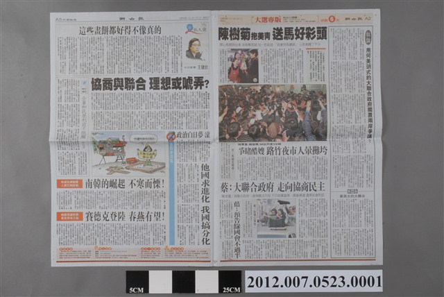 此為2012年1月8日發行的《聯合報》A1、A2、A15、A16版。內容要目計有〈超級星期天 馬蔡宋 大拼場〉、〈留日女命案 臺籍張嫌落網?烏龍一場〉、〈紐西蘭空難 熱氣球變火球 急墜地11死〉、〈社論:用何美玥式的大聯合政府擱置兩岸爭議?〉、〈黑白集:蔡英文的大聯合〉、〈陳樹菊抱美青送馬好彩頭〉、〈爭睹酷嫂 路竹夜市人暈攤垮〉、〈蔡:大聯合政府 走向協商民主〉、〈藍:預告綠國會不會過半〉、〈名人堂:這些畫餅都好得不像真的〉(王健壯)、〈協商與聯合 理想或唬弄?〉(楊奉順)、〈選戰麥克風:政治白日夢 滾〉、〈他國求進化 我國搞分化〉、〈聯合筆記:企業和民眾利益不牴觸〉(林松青)、〈你還在綁鞋帶 人家已到終點 南韓的崛起 不寒而慄!〉、〈拋棄意識形態 看見市場工廠 賽德克登陸 春燕有望!〉等。