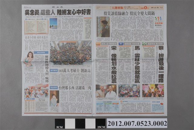 此物件刊載2012年的第13任總統副總統選舉的相關報導,此次選舉由代表中國國民黨的馬英九、吳敦義;代表民主進步黨的蔡英文、蘇嘉全;代表親民黨的宋楚瑜、林瑞雄參與選舉。在選舉當中,中國與臺灣的「兩岸政見議題」成為人民選舉的重要觀察指標(王顥穎,2015:48-75)。另外、「塑化劑」、「宇昌案」、「夢想家音樂劇」、「三隻小豬」等等,都成為影響當時人民投票意向的事件。最終,代表國民黨的馬英九、吳敦義組合當選,馬英九成功連任第13任總統。