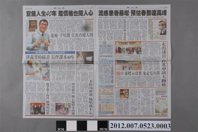 此為2012年1月8日發行的《聯合報》A5、A6、A11、A12版。內容要目計有〈臺選舉 港人瘋 觀選旅遊團爆滿〉、〈港年輕人追雙英 網路有攻略〉、〈楊毅:兩岸商談需九二共識 綠營:請重述九二共識內涵〉、〈流感患者暴增 預估春節達高峰〉、〈走出迷宮 臺北車站大翻修〉、〈今起雨勢緩 陽光露臉〉、〈彰化雞場 證實染禽流感〉、〈返鄉投票 台鐵加開八班〉、〈當鋪人生40年 鑑價格也閱人心〉、〈龍袍、手尾錢 當出冷暖人間〉、〈羅漢腳不是我 去世百日紀念展 洪義男的插畫 長伴課本40年〉、〈腦袋開刀 數字開竅:卡拉OK歌號 他唱過不忘〉、〈單車環臺 難忘施與受的臉〉、〈施孝榮王海玲 歐洲唱民歌〉、〈藍替陳定南討公道 綠反批抹黑〉、〈100年好兆頭 出生、結婚數暴增〉、〈青年讚士團 凱道躺12道光芒〉、〈治國週記 世大運若成功 馬:辦奧運有望〉、〈羅福助提告 士檢:偵察合法〉、〈曾煥嘉遭緝「替父跑攤不出面」〉、〈慈濟春聯 證嚴法師 讓好話說長一點〉等。