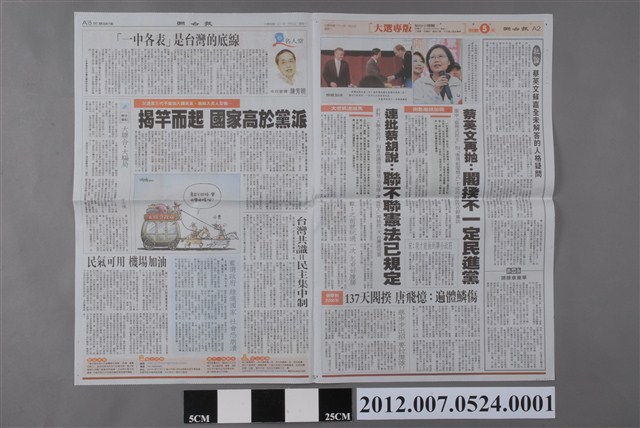 此為2012年1月9日發行的《聯合報》A1、A2、A15、A16版。內容要目計有〈超級星期天 雙英搶票 南北對殺〉、〈花蓮利益優先 與宋痛苦切割 傅崐萁今站台挺馬〉、〈留日女命案 通緝張志揚〉、〈社論:蔡英文蘇嘉全未解答的人格疑問〉、〈黑白集:請誰拿藥單〉、〈蔡英文再拋:閣揆不一定民進黨〉、〈連批蔡胡說:聯不聯憲法已規定〉、〈倒帶到2000年 137天閣揆 唐飛憶:遍體鱗傷〉、〈蔡步步出招 要拉攏誰?!〉、〈名人堂:「一中各表」是臺灣的底線〉、〈父遺言三代不能加入國民黨,我陷入天人交戰…揭竿而起 國家高於黨派〉、〈聯合筆記:大聯合,大騙局〉、〈臺灣共識=民主集中制〉(石之瑜)、〈藍選政府 綠選國家 社會恐崩潰〉等。