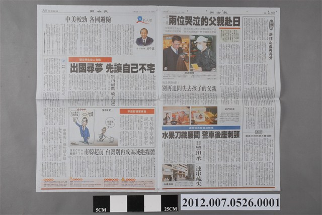 此為2012年1月11日發行的《聯合報》A1、A2、A15、A16版。內容要目計有〈大選倒數 股匯齊揚 外資回來了〉、〈社論:居住正義再得分〉、〈黑白集:蔡英文照例絕不會道歉〉、〈一早一晚 兩位哭泣的父親赴日〉、〈吳念真臉書:別再追問失去孩子的父親〉、〈還原張志揚自殺現場 水果刀藏腰間 警車後座刺頸〉、〈名人堂:中美較勁 各國避險〉(林中斌)、〈留日學生殺人自裁 出國尋夢 先讓自己不宅〉、〈別再逼問 放了張爸〉、〈聯合筆記:平行時空下的約定〉(陳東旭)、〈李遠哲領軍背書 用科學家精神 說明宇昌案吧〉、〈沒ECFA難簽FTA 南韓超前 臺灣別再成區域絕緣體〉、〈華爾街日報的諸多錯〉等。