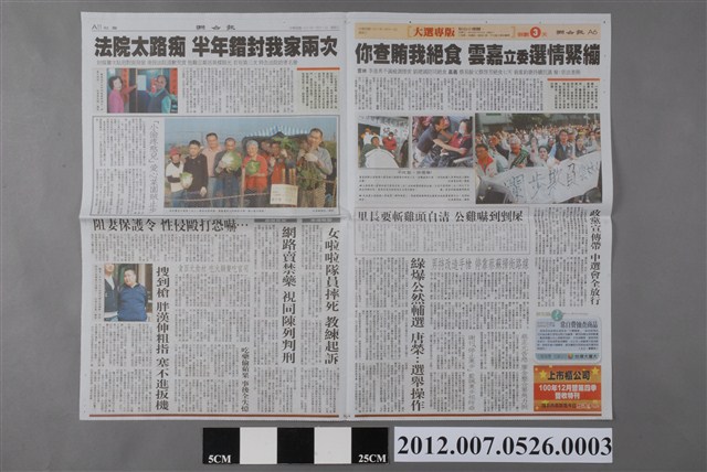 此為2012年1月11日發行的《聯合報》A5、A6、A11、A12版。內容要目計有〈吳王霞告別式 陳菊不挺致中 珍嘆人情冷暖〉、〈郭玟成:最後一戰 林國正:每次都講〉、〈人民要什麼政府? 宋:聯合政府 不是聯合分贓 蔡停止內耗 組成財經內閣 馬:養成清廉 不必等到選上〉、〈臺南掃街 臨時行程 訪尤清弟 吳揆:有些樁不必拔〉、〈你查賄我絕食 雲嘉立委選情緊繃〉、〈里長要斬雞頭自清 公雞嚇到剉屎〉、〈政黨宣傳帶 中選會全放行〉、〈男持改造手槍 停靠蔡蘇掃街路線〉、〈蔡正元告急 廖金整合要角力挺〉、〈謝刊「停止奧步」 藍諷傲步祖師爺〉、〈綠爆公然輔選 唐榮:選舉操作〉、〈法院太路痴 半年錯封我家兩次〉、〈「小偷疼憨兒」愛心菜園賊止步〉、〈未借軟墊 女啦啦隊員摔死 教練起訴〉、〈虛擬貨架 網路賣禁藥 視同陳列判刑〉、〈阻妻保護令 性侵毆打恐嚇〉、〈貪百元食材 吃火鍋變吃官司〉、〈吃藥偷蘋果 事後全失憶〉、〈搜到槍 胖漢伸粗指 塞不進扳機〉、〈吳興國李爾在此 今起義大利公演〉、〈貼近漫畫之神 手塚到臺中〉、〈彰化縣政府論壇 揚升魔鬼訓練 改變曾雅妮〉等。