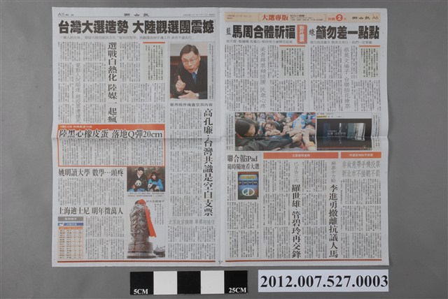 此物件刊載2012年的第13任總統副總統選舉的相關報導,此次選舉由代表中國國民黨的馬英九、吳敦義;代表民主進步黨的蔡英文、蘇嘉全;代表親民黨的宋楚瑜、林瑞雄參與選舉。在選舉當中,中國與臺灣的「兩岸政見議題」成為人民選舉的重要觀察指標(王顥穎,2015:48-75)。另外、「塑化劑」、「宇昌案」、「夢想家音樂劇」、「三隻小豬」等等,都成為影響當時人民投票意向的事件。最終,代表國民黨的馬英九、吳敦義組合當選,馬英九成功連任第13任總統。