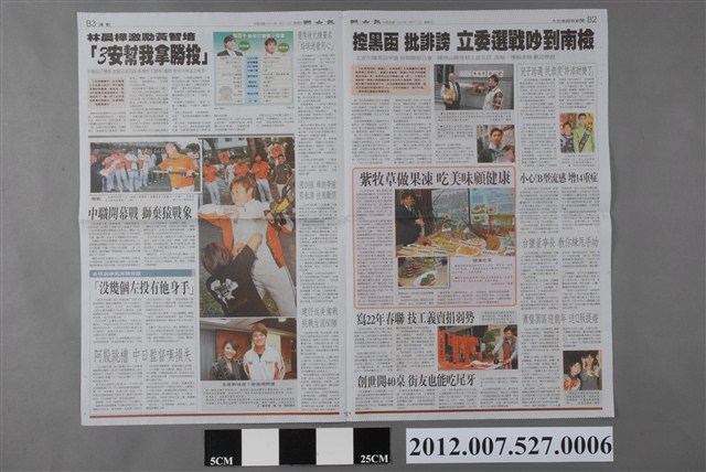 此為2012年1月12日發行的《聯合報》B1、B2、B3、B4版。內容要目計有〈綠營喊大贏 金小刀「我們不澎風」〉、〈綠號召4萬黨員 一起催票〉、〈控黑函 批誹謗 立委選戰吵到南檢〉、〈紫牧草做果凍 吃美味顧健康〉、〈小心!B型流感 增14重症〉、〈臺鹽董事長 教你練甩手功〉、〈蕭壟園區迎龍年 送Q版提燈〉、〈寫22年春聯 技工義賣捐弱勢〉、〈創世開40桌 街友也能吃尾牙〉、〈林晨樺激勵黃智培「3安幫我拿勝投」〉、〈選秀狀元練簽名 「給球員看用心」〉、〈國訓隊 輝總帶隊 郭泰源 技術顧問〉、〈中職開幕戰 獅棄猿戰象〉、〈建仔返美備戰 挑戰生涯60勝〉、〈金鶯總裁談陳偉殷 「沒幾個左投有他身手」〉、〈阿殷跳槽 中日監督嘆損失〉、〈美媒讚嘆:值得尊重的老人家 布萊恩帶傷攻48分〉、〈見老東家戰意濃 萊特準投 滅怒「火」〉、〈奧運美國男籃隊 黃金陣容護金牌〉、〈澳網會外賽 落後放開打 王宇佐逆轉第6種子〉、〈雪梨網球賽 輕鬆進8強 阿根廷一哥回來了〉、〈男子職撞總冠軍賽 盼好運別用玩 張玉龍跨季5連勝〉等。