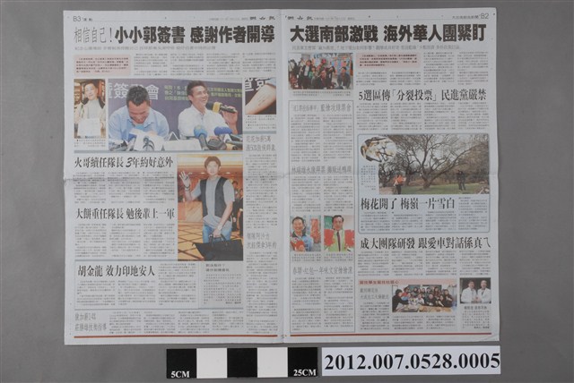 此為2012年1月13日發行的《聯合報》B1、B2、B3、B4版。內容要目計有〈最後一天超緊繃 藍綠造勢全拼了〉、〈注意!手機進投票所 有刑責〉、〈大選南部激戰 海外華人團緊盯〉、〈5選區傳「分裂投票」民進黨嚴禁〉、〈「這一票投給學甲」 藍搶攻綠票倉〉、〈林瑞雄永康拜票 攤販送鴨頭〉、〈梅花開了 梅嶺一片雪白〉、〈成大團隊研發 跟愛車對話係真ㄟ〉、〈留住學生留住社區心 戴明輝退休 大成志工火鍋歡送〉、〈春聯、紅包…年味文宣搶搶滾〉、〈相信自己!小小郭簽書 感謝作者開導〉、〈花花加薪5萬 漲50%傲視群象〉、〈火哥續任隊長 3年約好意外〉、〈大餅重任隊長 勉後輩上一軍〉、〈胡金龍 效力印地安人〉、〈關鍵時刻 大帝又熄火〉、〈3球星發威 延長賽止爵士〉、〈聽夫一席話 李娜逆轉克娃〉、〈澳網會外賽 張、謝闖頭關〉等。