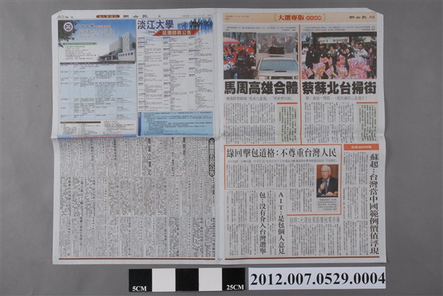 此為2012年1月14日發行的《聯合報》A5、A6、A15、A16版。內容要目計有〈蔡蘇北臺掃街 蔡:最後一哩路,一起充滿信心走過去!〉、〈馬周高雄合體 爆滿群眾嘶喊「馬英九當選」、「周美青加油」〉、〈綠回擊包道格:不尊重臺灣人民〉、〈投書紐約時報 蘇起:臺灣當中國範例價值浮現〉、〈紐時:大選結果影響核電存廢〉、〈走北宜、搭客運 可抽平版電腦〉、〈那些年,中山人吃的吳記水餃 再見了〉等。