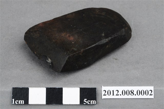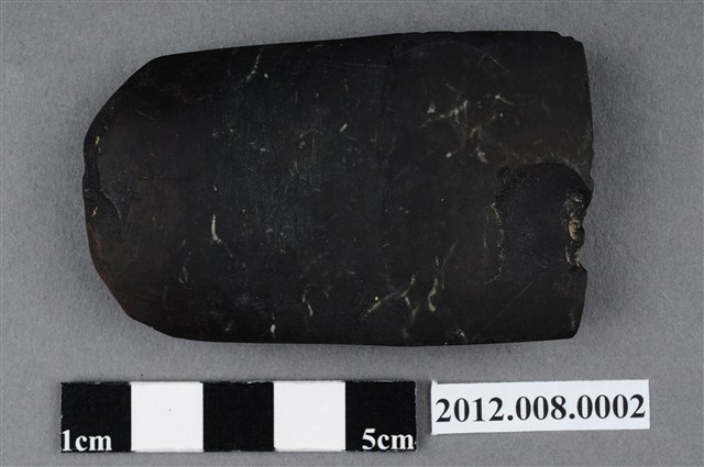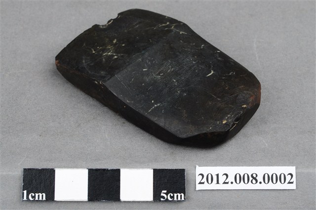 2. 本件為圓山文化相當典型的有段石錛,黑色硬頁岩材質,器表通體細磨,表面光滑平整,外型為扁平的長條型,轉折處磨製方角轉,柄端約與刃部同寬,刃部自器身正面近底端磨製出長1.3cm之斜面,形成偏鋒刃,沿刃線再加以細磨出刃端,刃端中段因使用消耗造成小缺損;背面器身中段帶一階梯式突起,便於裝置或綁縛木柄。