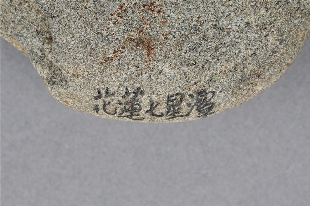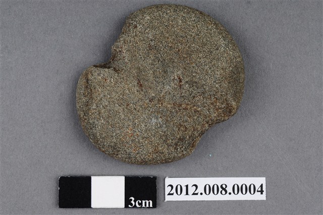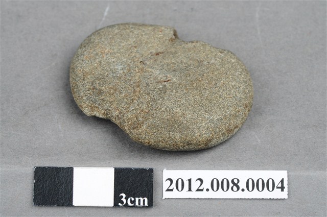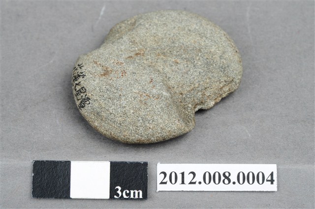 本件為劉鵠雄先生於2010年3月13日採集,器型為砝碼型石網墜,器身以灰色砂岩質鵝卵石為材,於左右兩側打出缺刻,以便綁縛於漁網上,沉網捕魚用。根據劉鵠雄先生之推測,本件史前文化類型可能為臺灣東部繩紋紅陶文化大坑類型。