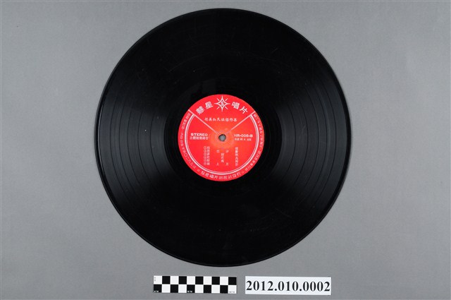 1.本物件為收錄胡美紅民謠傑作集,33又1/3轉之雙面黑膠唱片。橘紅色標籤上印刷有由慧星唱片出版社發行,出版登記証內版台音字第0265號,營利事業登記證北縣商乙字第872號。民國58年(1969)4月出版,另印有「STEREO立體廻聲錄音」字樣,編號HR-005-A,曲目內容:紅顏淚痕、純情夢、長宵自嘆、水仙花、異鄉戀夢。編號HR-005-B,曲目內容:相思樓、思念夢斷、夢歸暝、茫茫鳥、雁南歸、橋上月影。